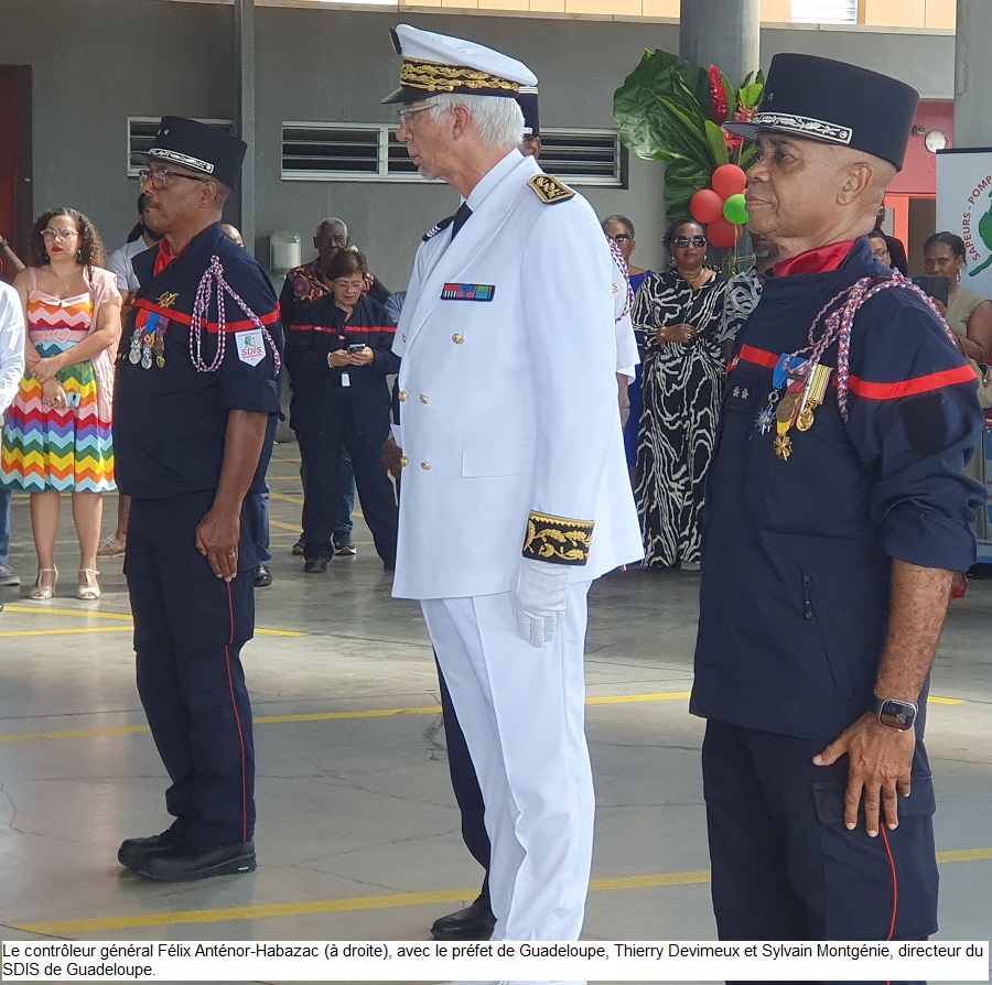 Après 42 ans de service, Félix Anténor-Habazac, contrôleur général, directeur du SDIS de Guadeloupe, a passé le relais au Guyanais Sylvain Montgénie, également contrôleur général,