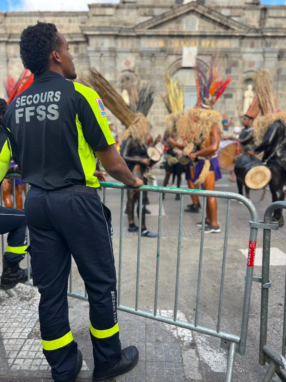 Les secouristes du CNRBT, du CDSSG 971 et de la FFSS au 1er rang dans le Carnaval guadeloupéen. Les Secouristes Opérationnels du CNRBT, du CDSSG
