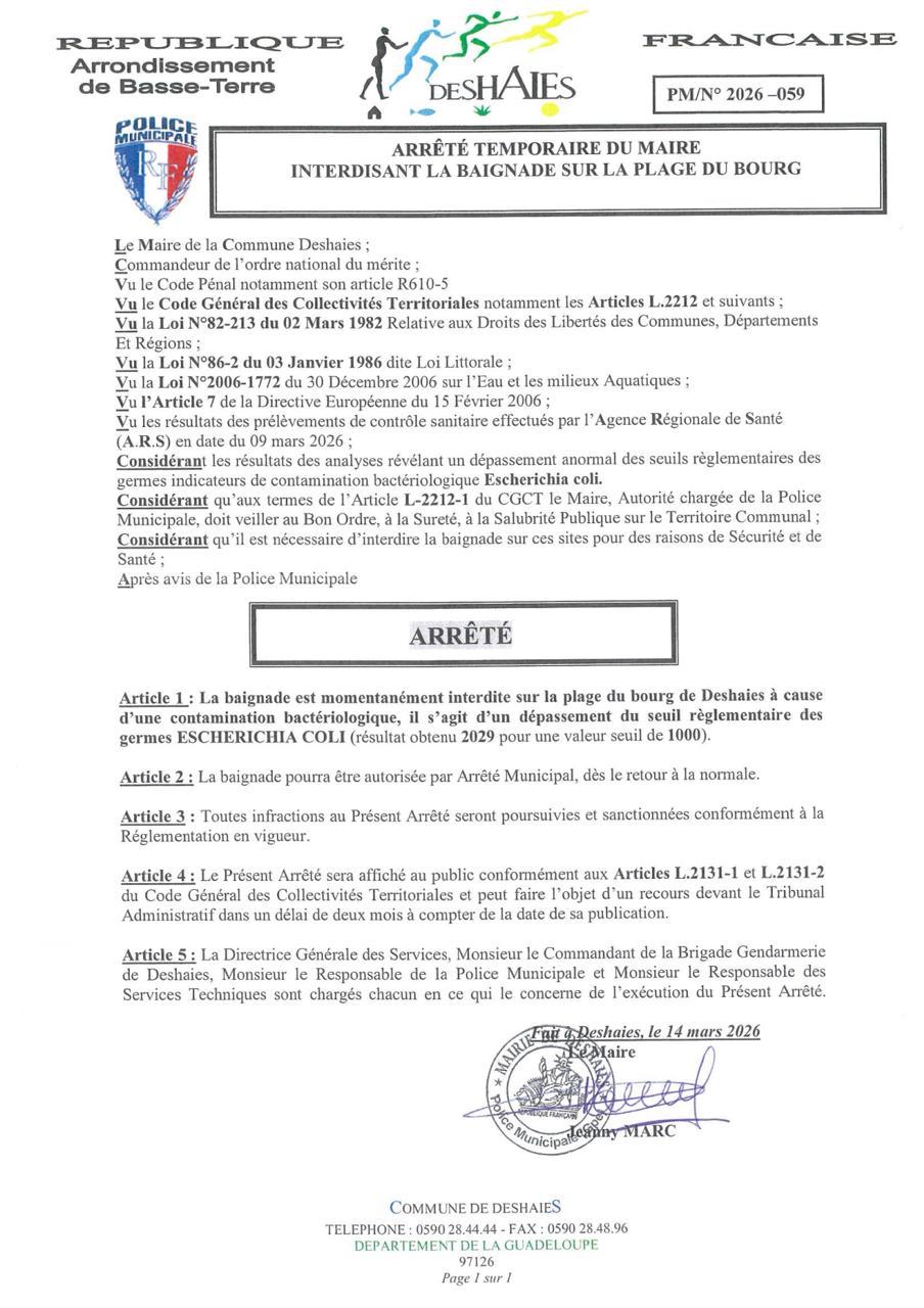 Par arrêté municipal N°2026-059, la baignade est temporairement interdite sur la plage du bourg de Deshaies. Cette décision fait suite à des analyses sanitaires révélant