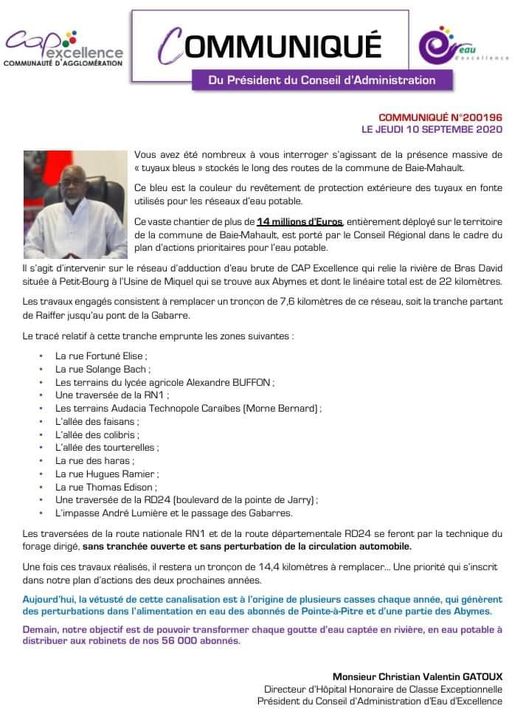 Cap Excellence, avec le soutien de la Région Guadeloupe, a entrepris un vaste chantier de 14 millions d’euros qui va durer une grande partie de l’année 2021, 14 kilomètres supplémentaires étant envisagés l’année prochaine pour pouvoir alimenter 56 000 abonnés de ce secteur très dense.