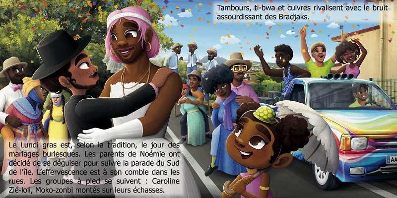 Dans cette collection, elle invite les jeunes lecteurs à partager les traditions des fêtes : Noël, Pâques… Cette fois, Noémie se laisse emporter par l’ambiance colorée et festive du carnaval aux Antilles.