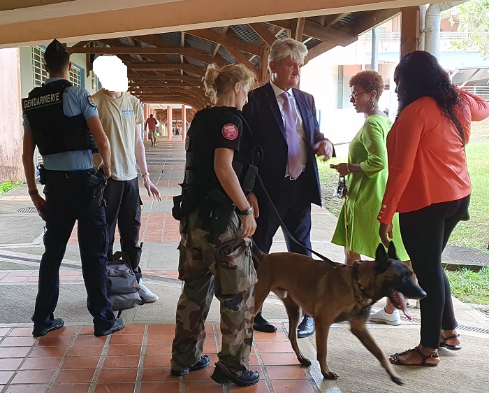 Ce contrôle est organisé à l’intérieur du lycée « pour garantir à l’ensemble des élèves que les conditions d’éducation sont réunies avec des bâtiments de qualité, des enseignants engagés, mais surtout, des conditions de sécurité et de sérénité réelles : pas d’armes, pas de drogue, pas de violence…, a indiqué Thierry Devimeux, préfet de Guadeloupe qui s’est adressé directement aux élèves. Nous avons besoin que ces jeunes réussissent dans leurs études, qu’ils apprennent dans de bonnes conditions pour mettre leur talent au service de ce département. »