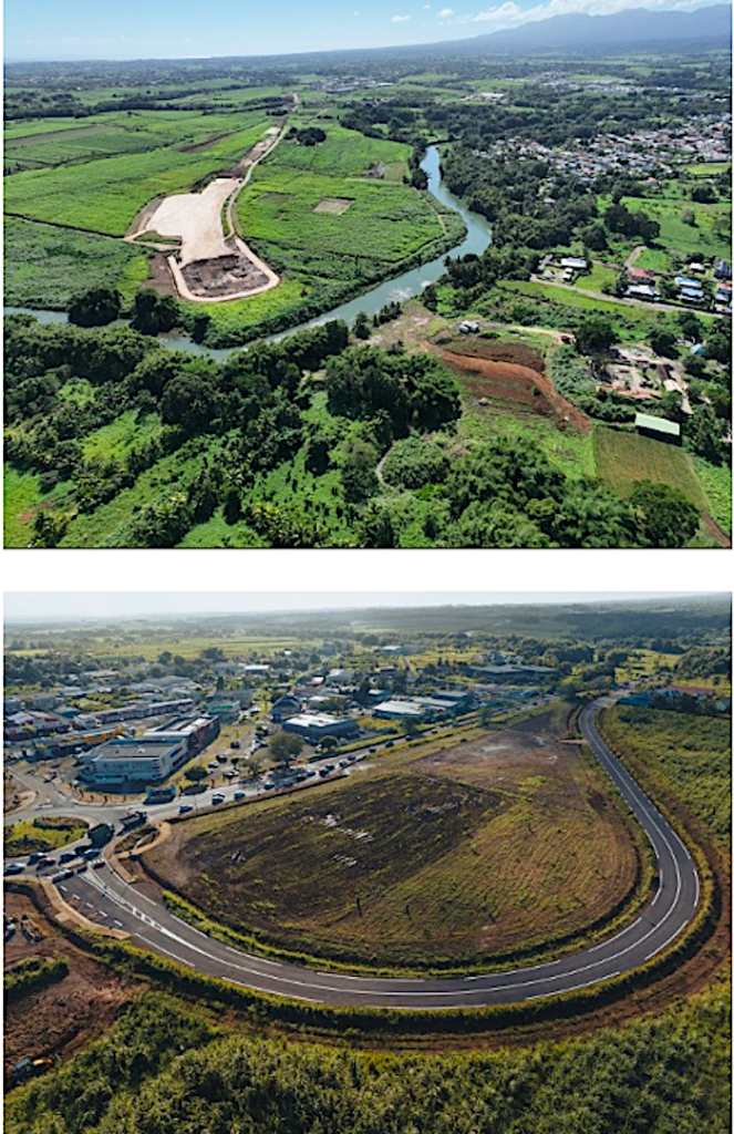Il s’agit d’un beau chantier sur le papier, avec une déviation à travers champs, deux ronds-points monumentaux pour filtrer les 70 000 voitures qui passent là chaque jour, un pont tout aussi grandiose. Il le faut pour franchir la Grande Rivière à Goyaves, véritable déferlement d’eau et montée de dix mètres chaque fois qu’il pleut un peu trop dans les hauteurs.