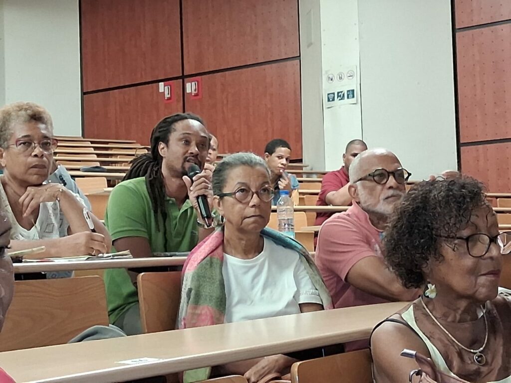 La problématique de l’eau en discussion avec le préfet Thierry Devimeux, à l’UA, provoquée par Marguerite Civis, présidente de l’association DECIDEE, de Gourbeyre, et d’autres associations d’usagers. Daniel Marianne, secrétaire de la Commission de surveillance du SMGEAG, a été choisi comme modérateur.