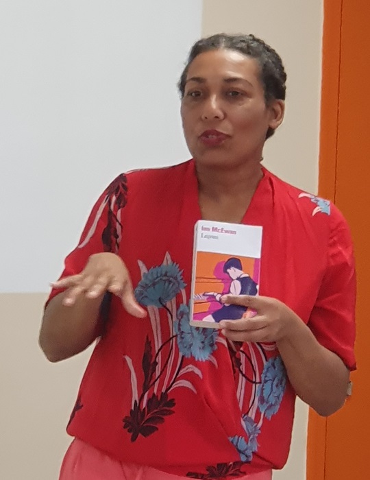 Au cours d’un premier atelier, les étudiants en Lettres à l’Université des Antilles, ont eu à imaginer la suite d’une strophe de poème proposée par Estelle-Sarah Bulle, avant de lire leurs productions à haute voix. Le deuxième groupe reçu par Estelle-Sarah Bulle, mardi 17 mars, au Camp Jacob, était composé d’une dizaine d’étudiants de la 1e année de la Classe Prépa littéraire du lycée Gerville-Réache, accompagnés de Mireille Cruces, prof d’espagnol et de littérature et d’Elodie Borel, prof de Lettres classiques. Cette fois, en 10 minutes, à partir d’une amorce fournie par l’auteure, ils ont eu à rédiger la suite d’une intrigue.