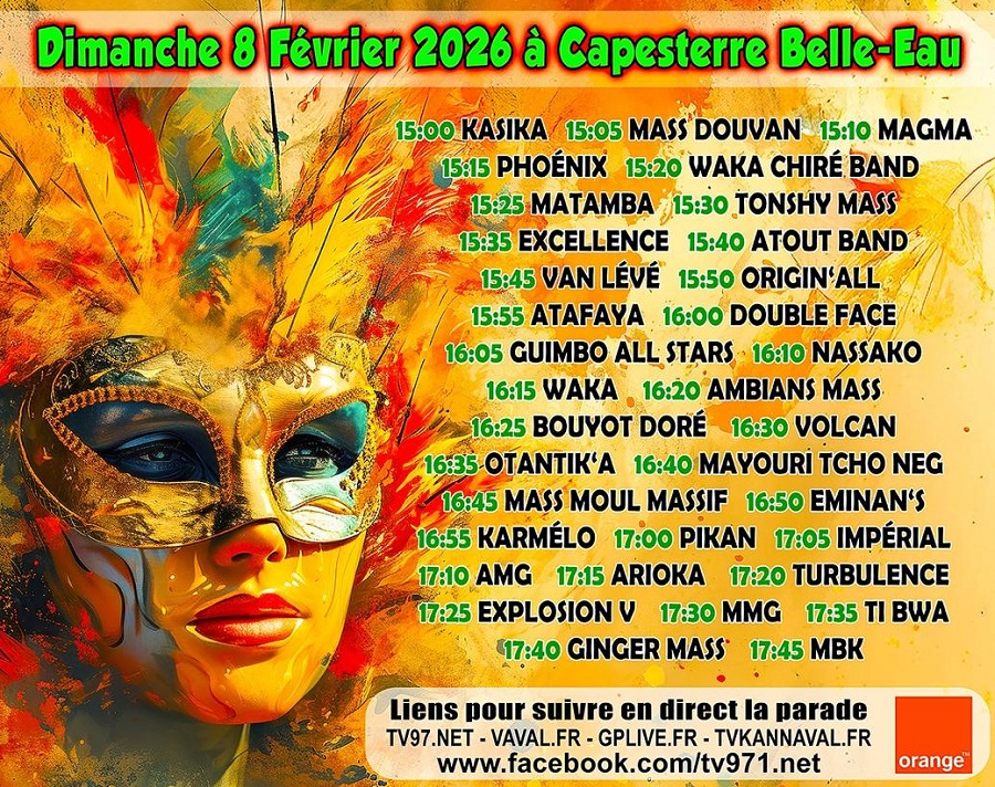 Sont attendus : Double Face, Waka Chiré Band, Eminan’s, Arioka, Bouyot doré, A tout band, Matamba, Waka, Turbulence, Excellence, Karmelo, Kasika, Mass Moul Massif, Phoenix, Pikan, Tonshi Mass, Mouvman Mas Gwadloup, Magma, Van lévé, Ti-bwa, Ata Faya, Origin’All, Volcan… Un autre groupe de Capesterre Belle-Eau, Moun Bitasyon Kapestè (MBK) clôturera la parade.