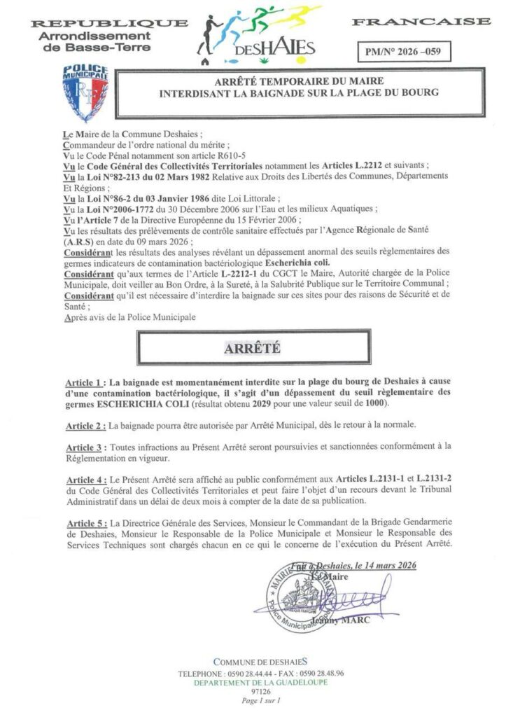 Par arrêté municipal N°2026-059, la baignade est temporairement interdite sur la plage du bourg de Deshaies.