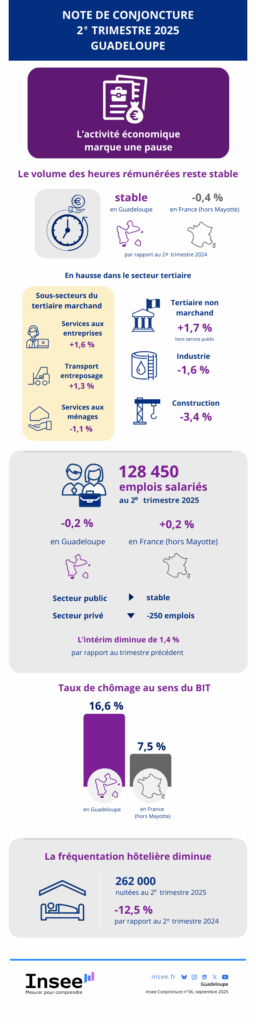 Au deuxième trimestre 2025, l’activité économique de la Guadeloupe, mesurée par le volume des heures rémunérées, marque une pause sur un an, après un premier ralentissement constaté au début de l’année. Source INSEE