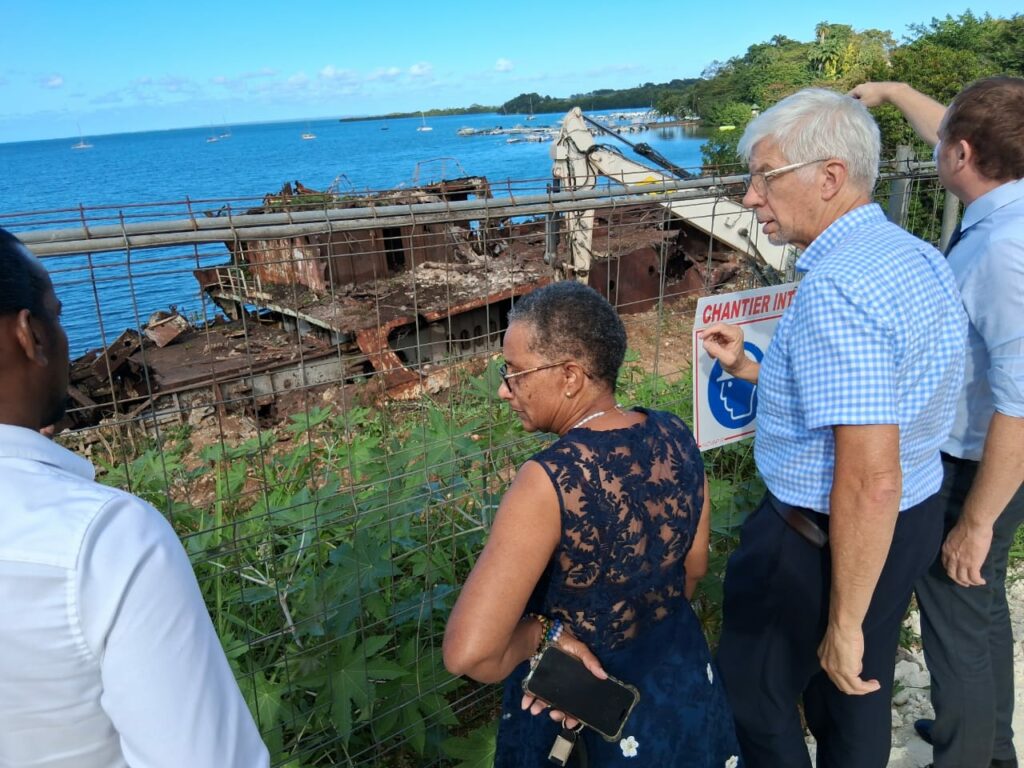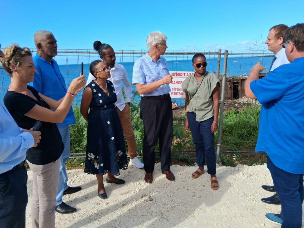 Hélène Polifonte, accompagnée d’élus, Justin Dessout, premier adjoint, Jocelyne Eustache, douzième adjointe, a accueilli sur ses terres, en bord de mer, non loin du cimetière, de la marina et des bâtiments de la résidence Ti Café, le préfet de Région Thierry Devimeux, le député européen (RN) Rody Tolassy, le directeur de la Mer, Edouard Weber, des techniciens.