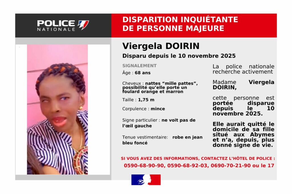 La Police nationale sollicite à nouveau votre vigilance concernant la disparition inquiétante de Madame DOIRIN Viergela.