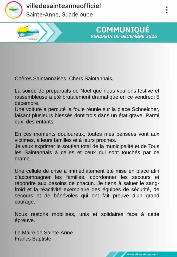 Vendredi soir, à Sainte-Anne, une voiture a fauché plusieurs personnes, dont des enfants, sur la place centrale. Trois blessés ont été évacués en urgence. Guy Losbar, président du Conseil départemental, a immédiatement réagi.