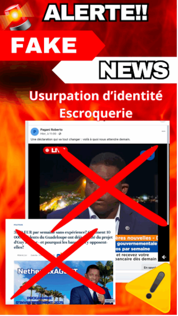 Cette vidéo, falsifiée, met en scène le président du Conseil départemental sur le plateau du JT de Guadeloupe la Première et encourage la population à investir dans un dispositif financier fictif, présenté comme très rentable.