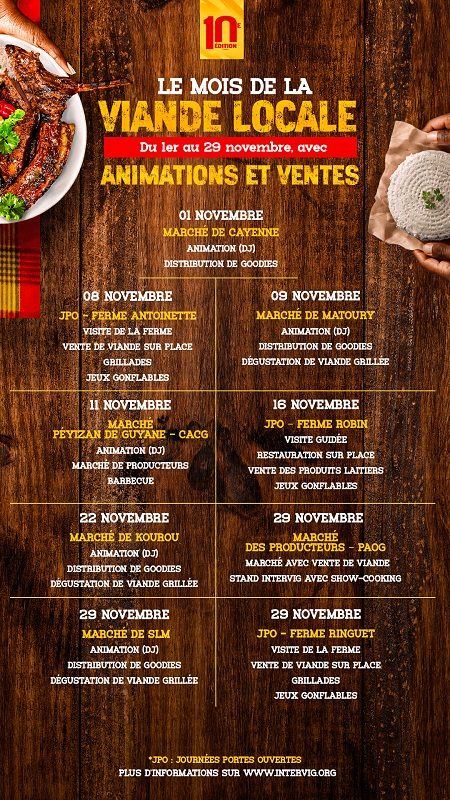 Après une ouverture au marché de Cayenne, samedi 1er novembre, Le Mois de la viande locale proposera une première Journée portes ouvertes, samedi 8 novembre, à la ferme Antoinette, savane Matiti, à Macouria, de 8 à 17 heures : visite de la ferme, vente de viande sur place, grillades, jeux gonflables…)