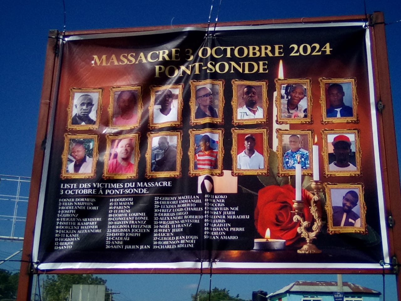 Un cercle de méditation a été formé au Carrefour de Pont-Sondé en souvenir des corps sans vie qu’on y apportait l’an dernier. Des dizaines de bougies ont été allumées et déposées autour d’un tronc d’arbre sous le billboard. Là, le commissaire du gouvernement, Me Venson François, dans un bref discours, a rassuré les Sondélais que « justice sera rendue au peuple. »