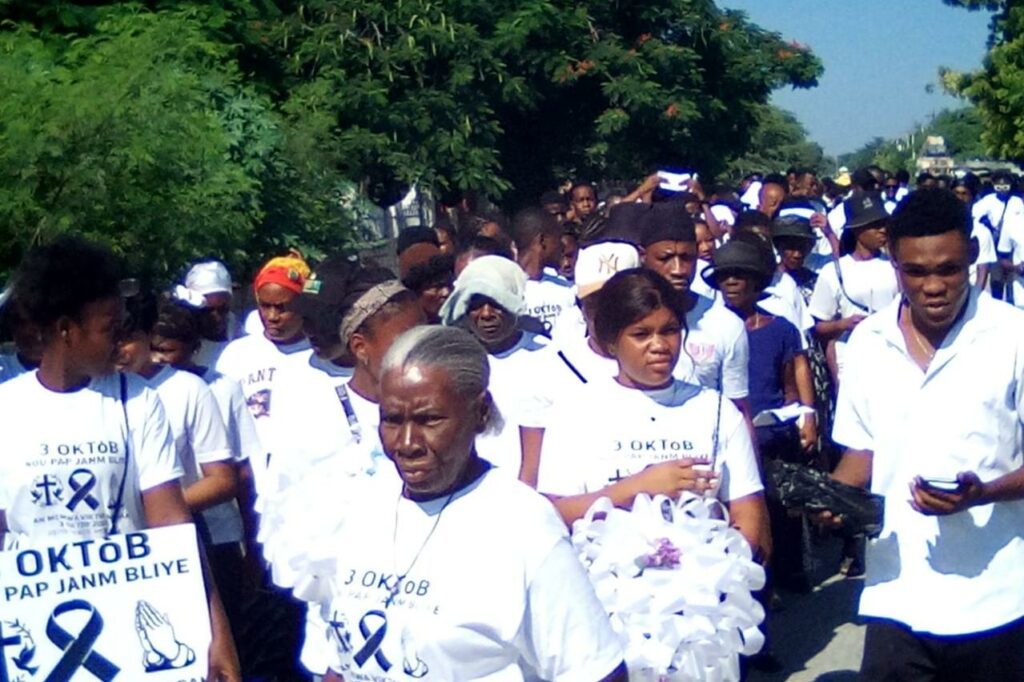 La marche funéraire mémorielle s’est transformée en une manifestation populaire où la foule chantait et criait « Justice », « Fòk Savyen kraze », « Ponsonde p ap tèritwa pèdi ». Arrivée devant l’entrée principale de l’Organisme de développement de la Vallée de l’Artibonite (ODVA), la foule s’est retournée en direction du Carrefour de Pont-Sondé, où un billboard, affichant des photos et les noms des cinquante personnes tuées, est dressé.