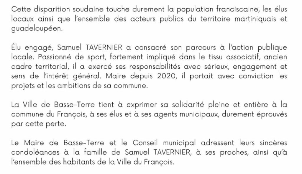 Le maire de la Ville de Basse-Terre, André Atallah, et l’ensemble du Conseil municipal ont appris avec une profonde émotion le décès brutal de Samuel Tavernier, maire de la Ville du François, survenu dans la nuit de samedi à dimanche des suites d’une crise cardiaque.