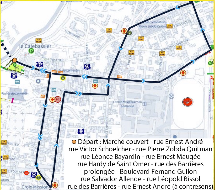 Le parcours : départ pont du Calebassier – marché couvert- rue Ernest André – rue Victor Schœlcher – rue Pierre Zobda-Quitman – rue Léonce Bayardin – rue Ernest Maugée – rue Hardy de Saint Omer – rue des Barrières prolongée – boulevard Fernand Guilon – rue Salvador Allende – rue Léopold Bissol – rue des Barrières – rue Ernest André (à contre sens).