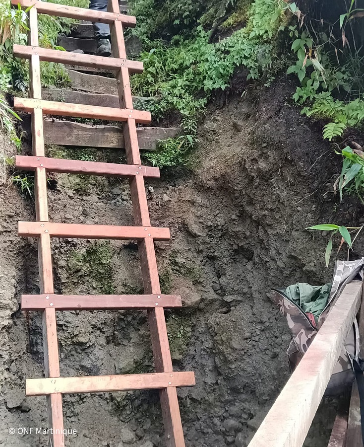La pose d’échelles de meunier, de garde-corps et l’ajout de platelages supplémentaires facilitent désormais l’ascension de la caldeira de la Montagne Pelée en toute sécurité.