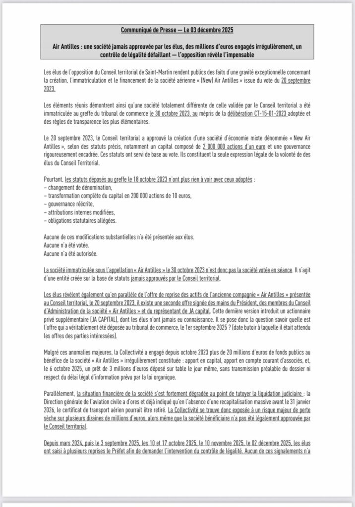 La Collectivité de Saint-Martin prend acte du communiqué de presse diffusé par les élus de l’opposition, jeudi 4 décembre 2025, concernant la société Air Antilles et tient à rétablir la réalité des faits. Les affirmations publiées reposent sur des interprétations erronées, des amalgames et des approximations.